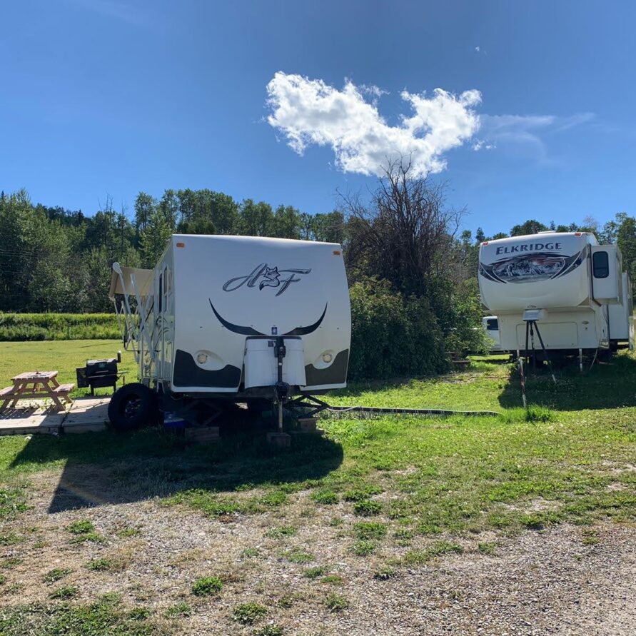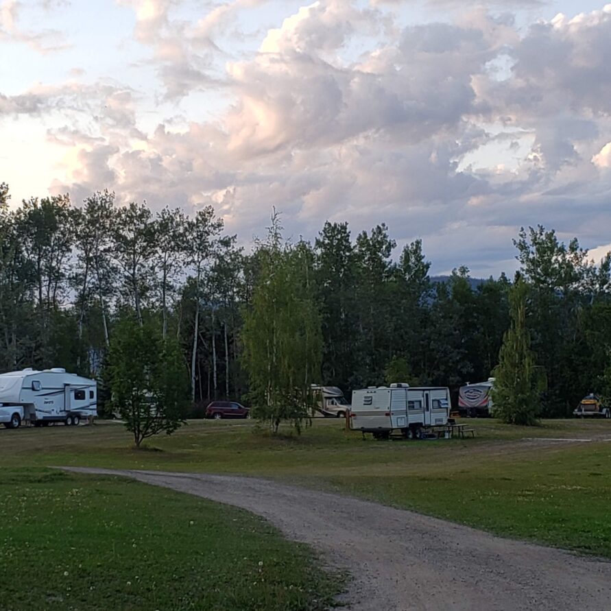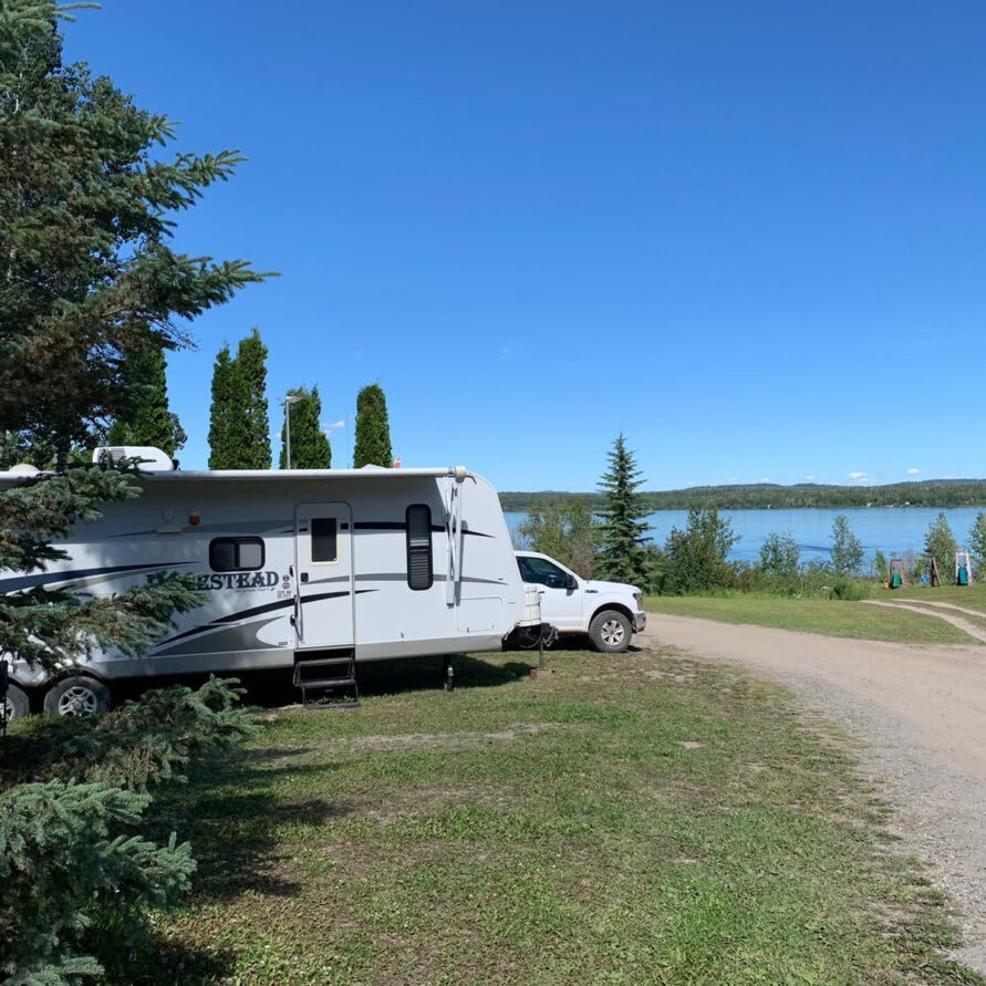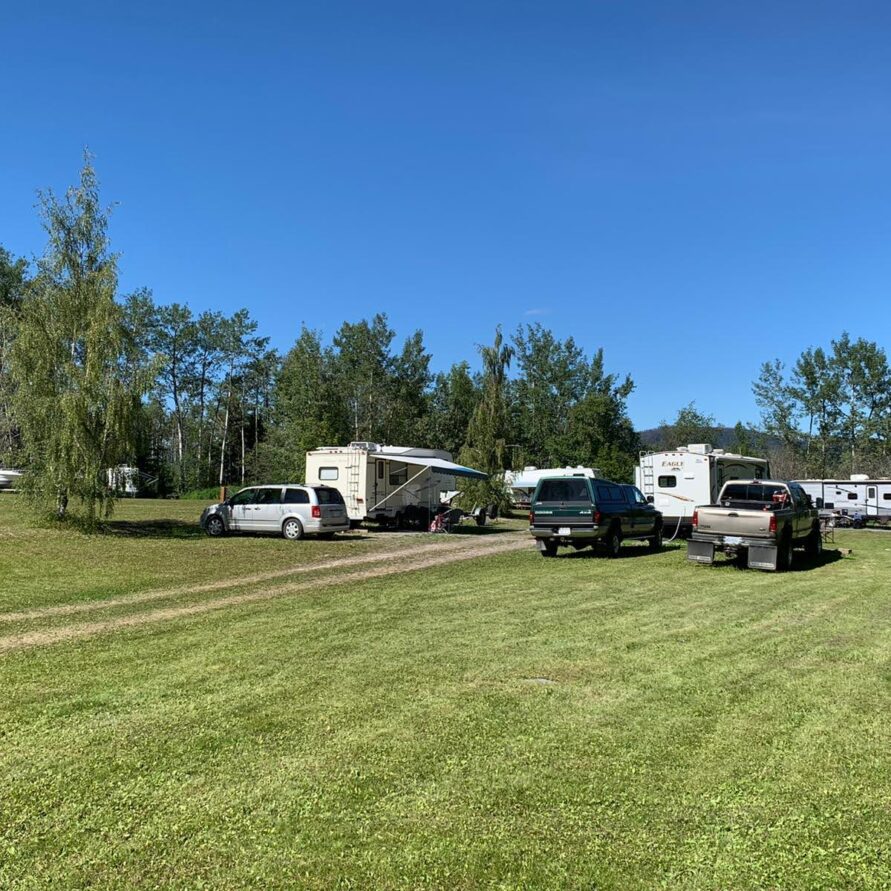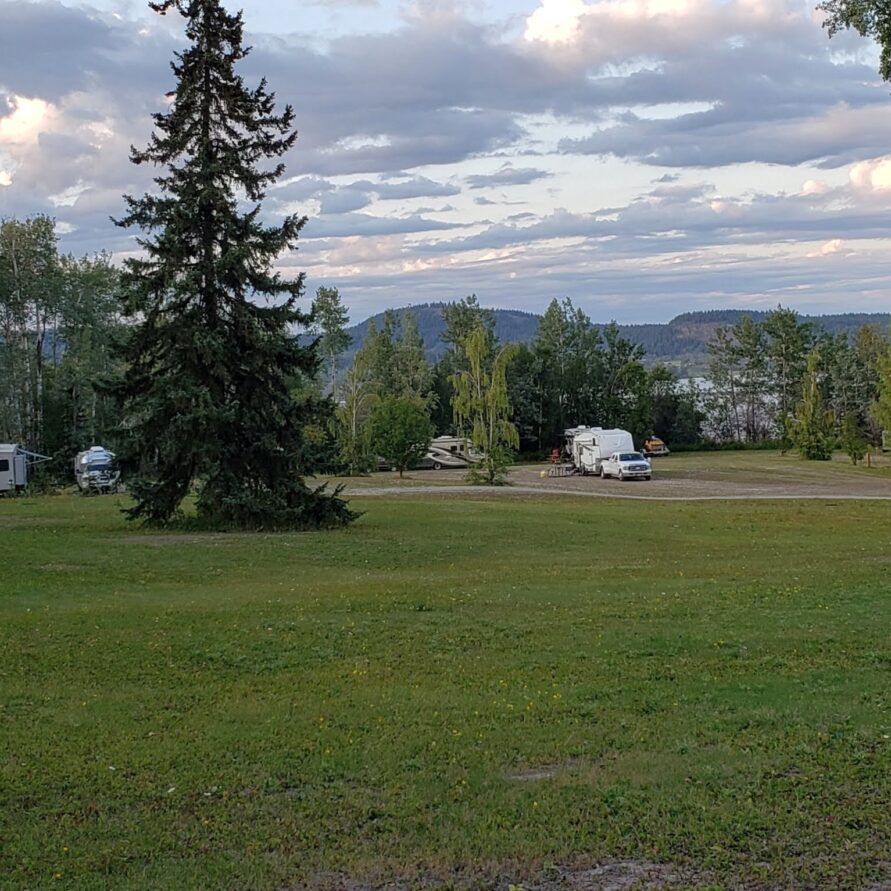 Full Hook-up RV Sites overlooking beautiful Fraser Lake featuring 30 amp electrical service, water, and direct sewer connections.